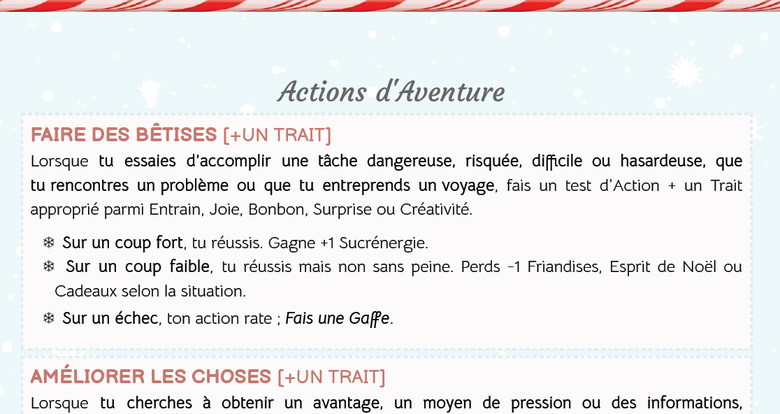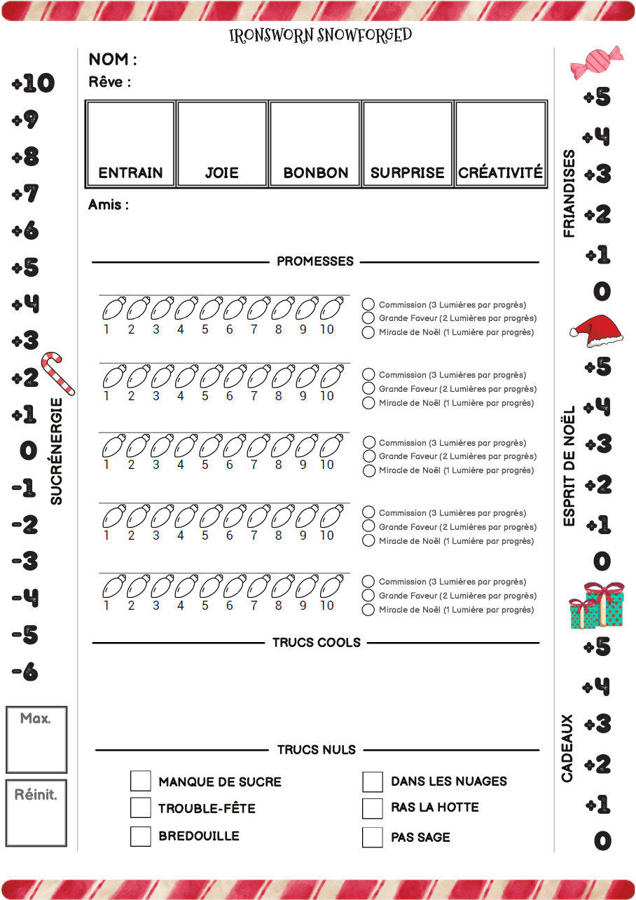 Ironsworn Snowforged est gratuit pour que tout le monde puisse en profiter. Il t'offrira le nécessaire pour imaginer et jouer des histoires pleines de rebondissements, de bêtises, de cadeaux et de friandises ! Alors si ta lecture ou tes parties t'ont plues, on serait ravis de le savoir en commentaire, ou grâce à une bonne note sur Itch.io. Cela nous fera plaisir (à l'auteur de la VO et à moi) et aidera les autres à trouver plus facilement ce petit jeu de rôles parmi tant d'autres sur Itch.io.
