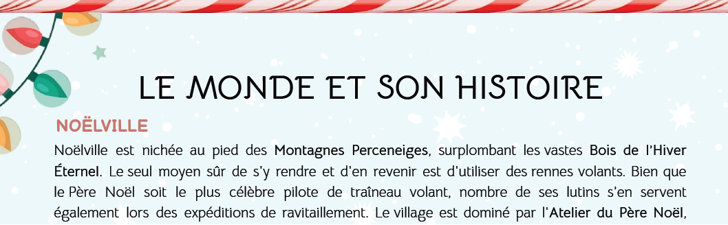 - Une présentation de la région de Noëlville et ses habitants (lutins, yétis,…)