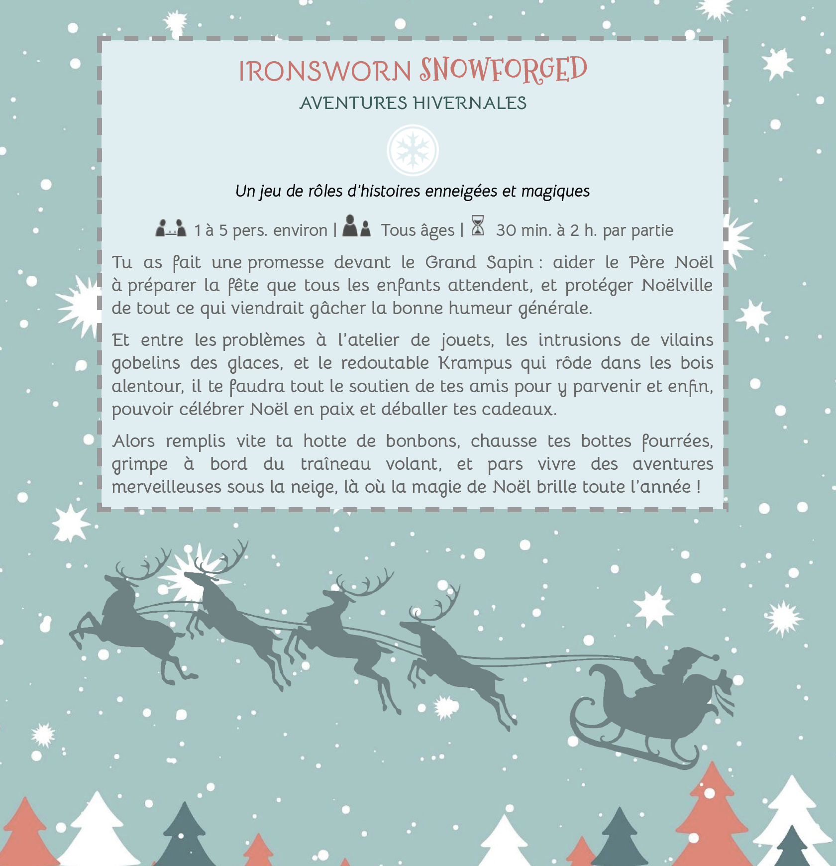 | Tags | Christmas, debutant, enfant, GM-Less, ironsworn, jdr, jeu-de-role, multi, noel, Solo RPG |